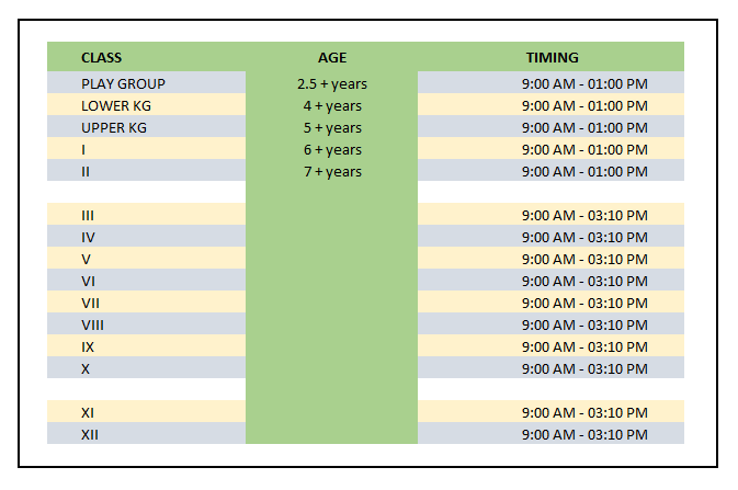 The table below shows the required minimum age of the children to be eligible for admission to different classes in reference to 1st April of the year in which admission is sought for.